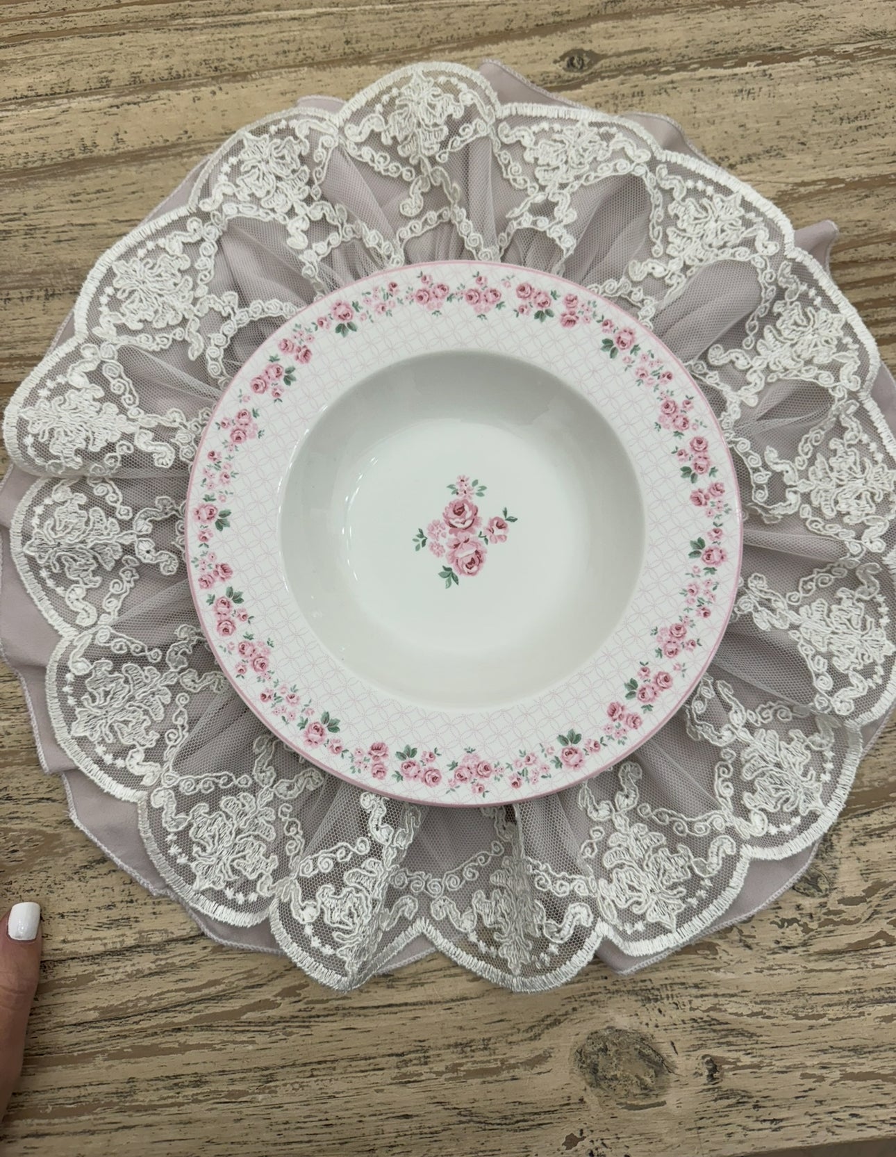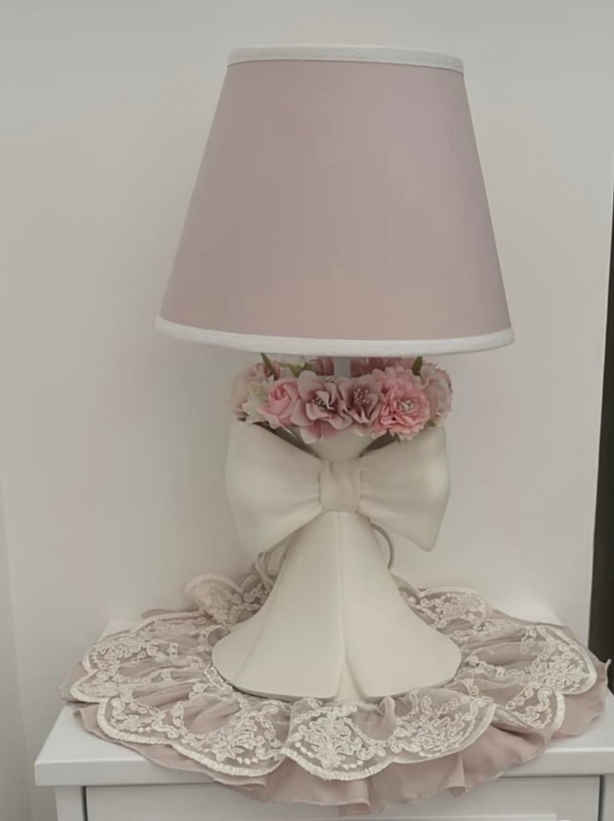 Centrino per comodino rosa cipria e pizzo