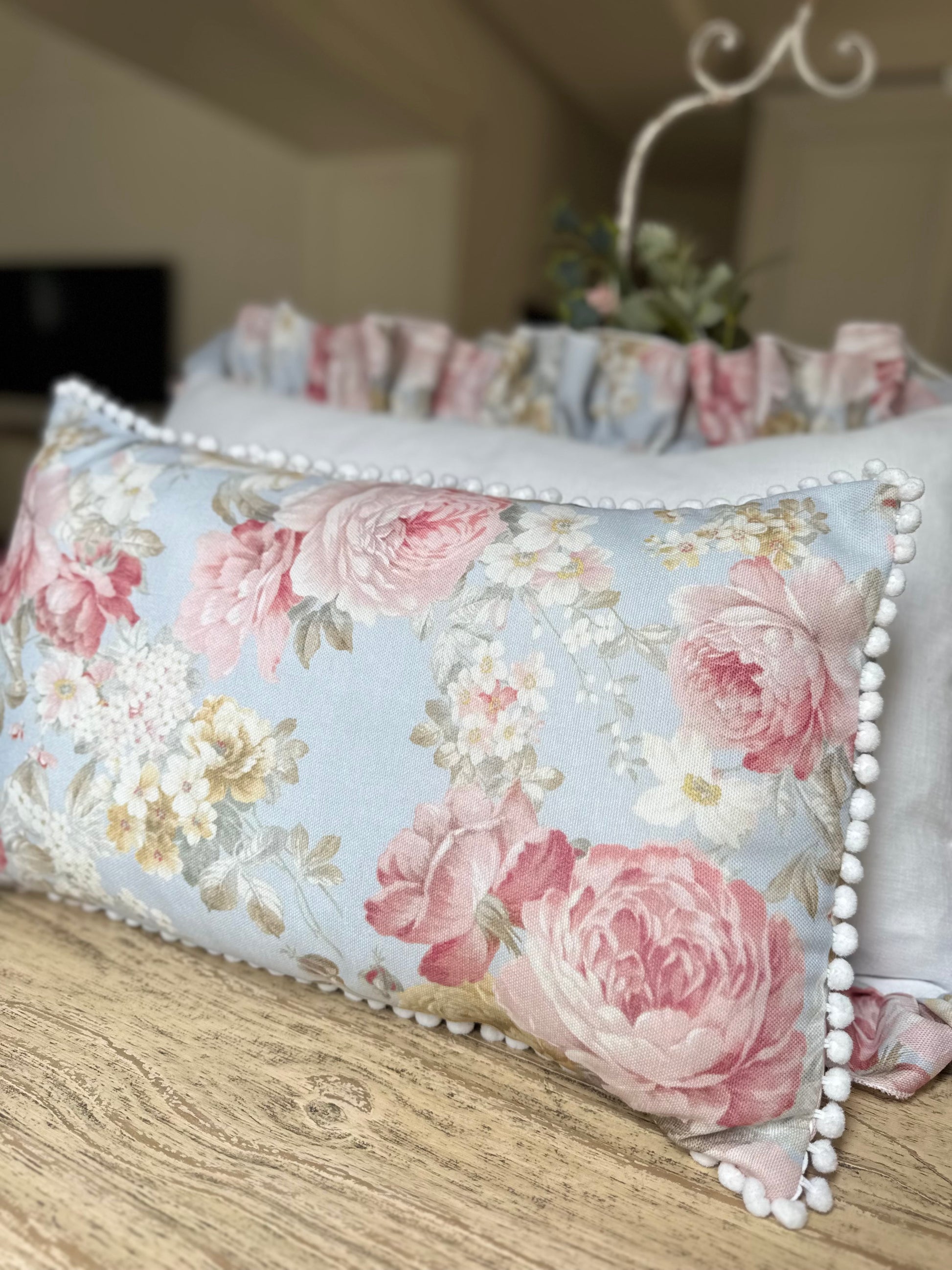 La stampa floreale dona freschezza e delicatezza, mentre il bordo con pon pon bianchi aggiunge un dettaglio giocoso e sofisticato.