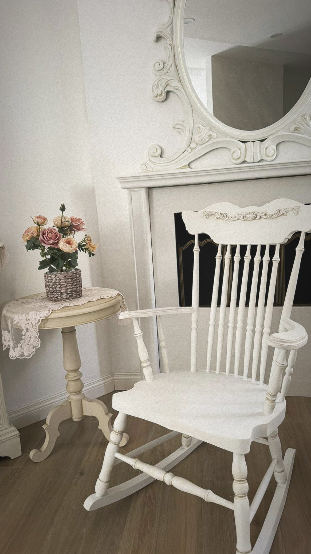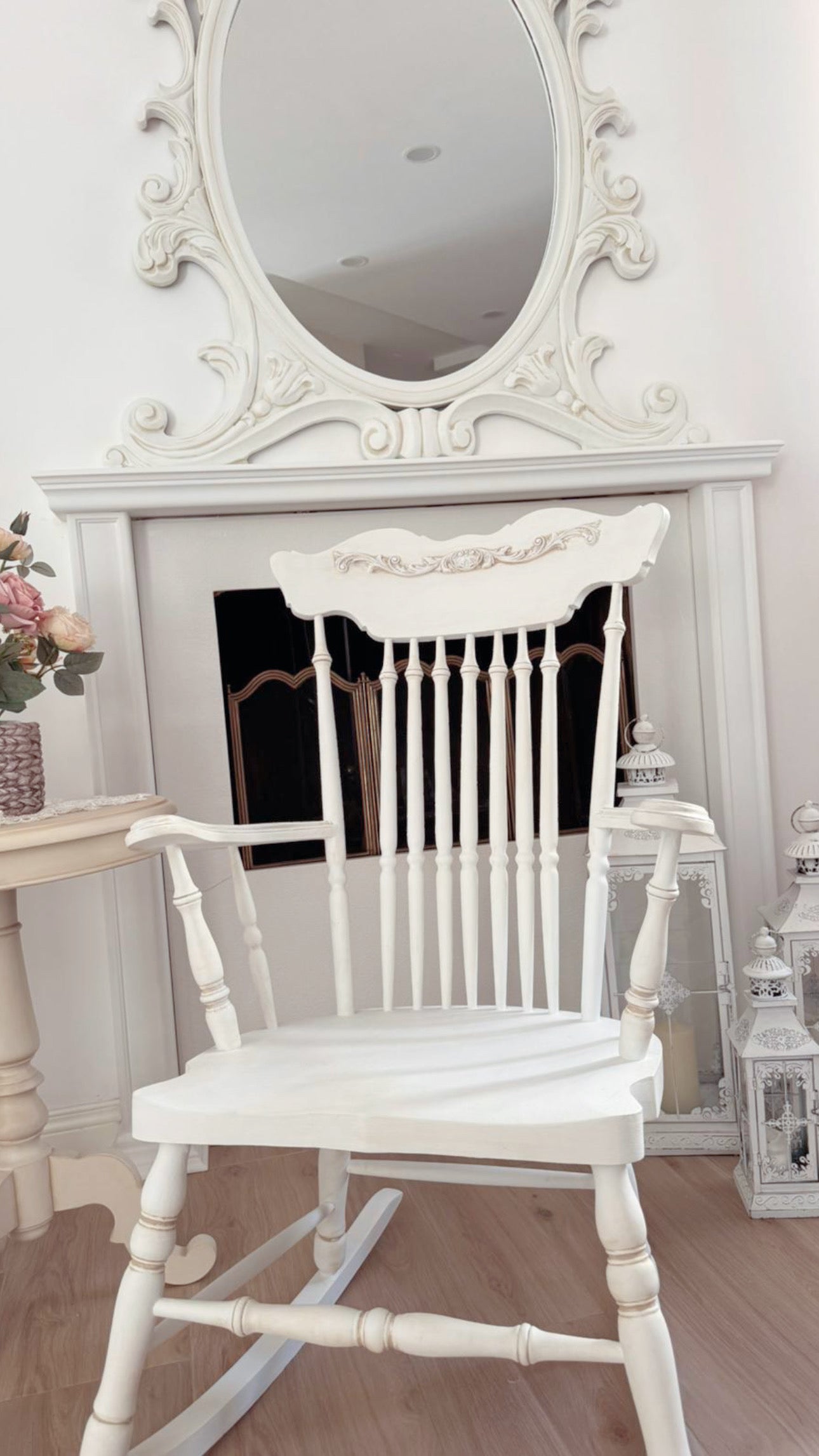 Questa elegante sedia a dondolo bianca è impreziosita da un fregio decorativo finemente lavorato, che le conferisce un’eleganza senza tempo.
