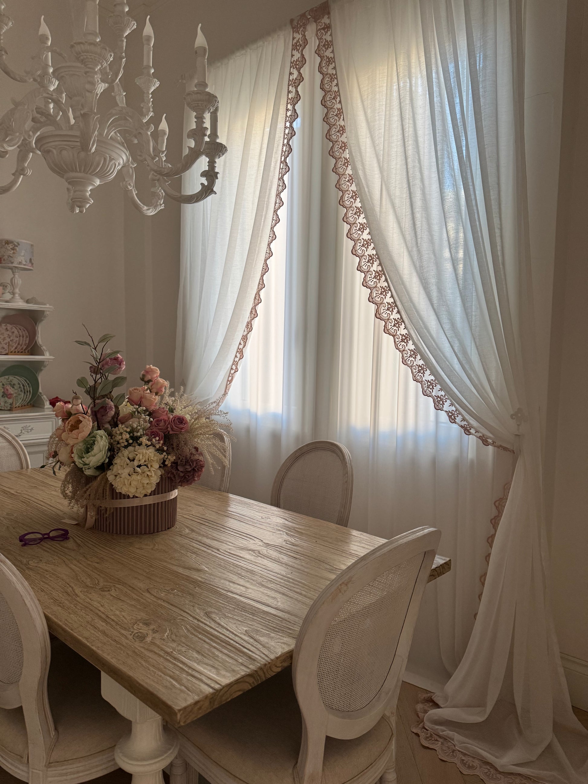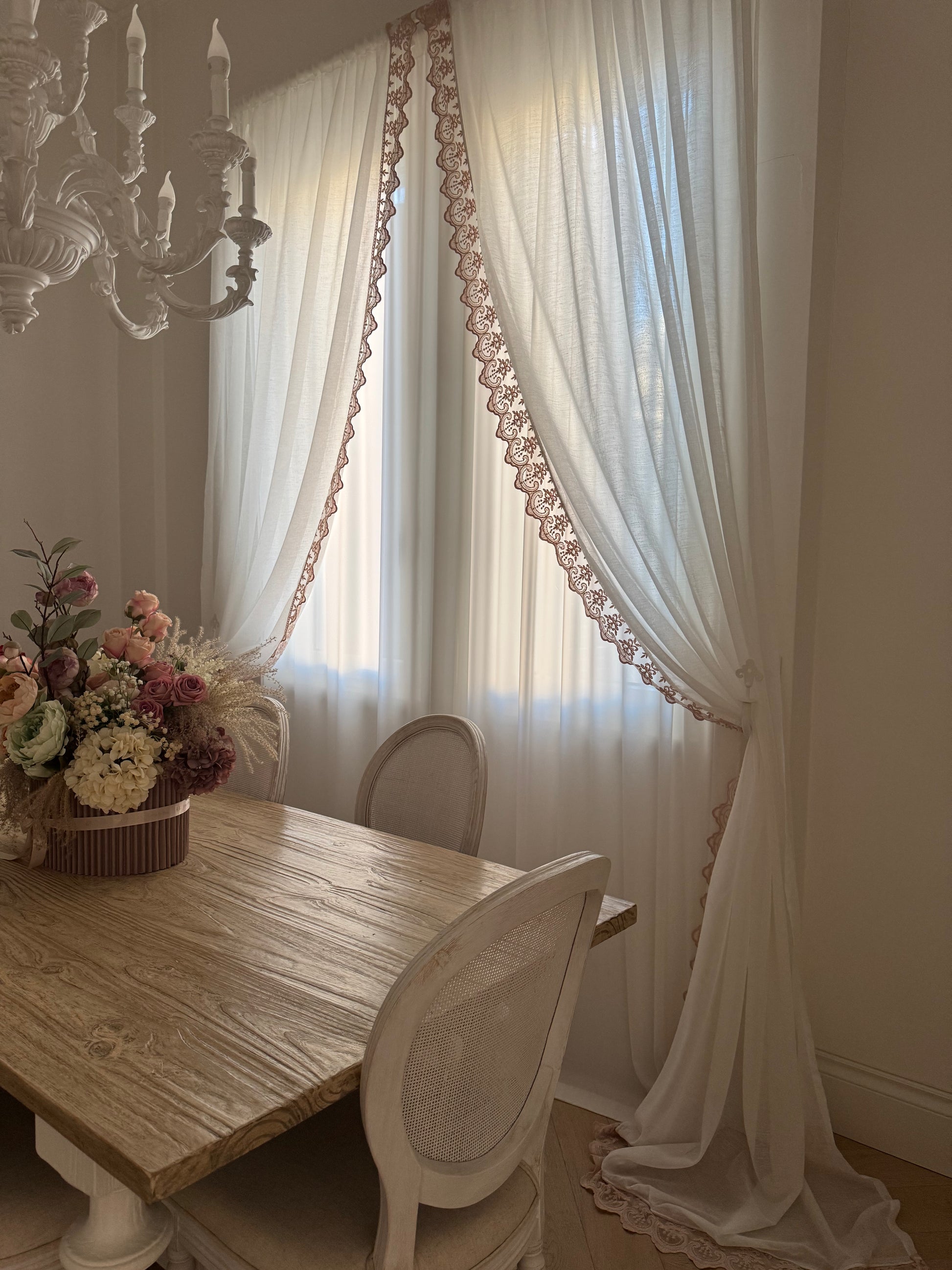 Tenda a due calate in misto lino con bordo in pizzo francese rosa cipria