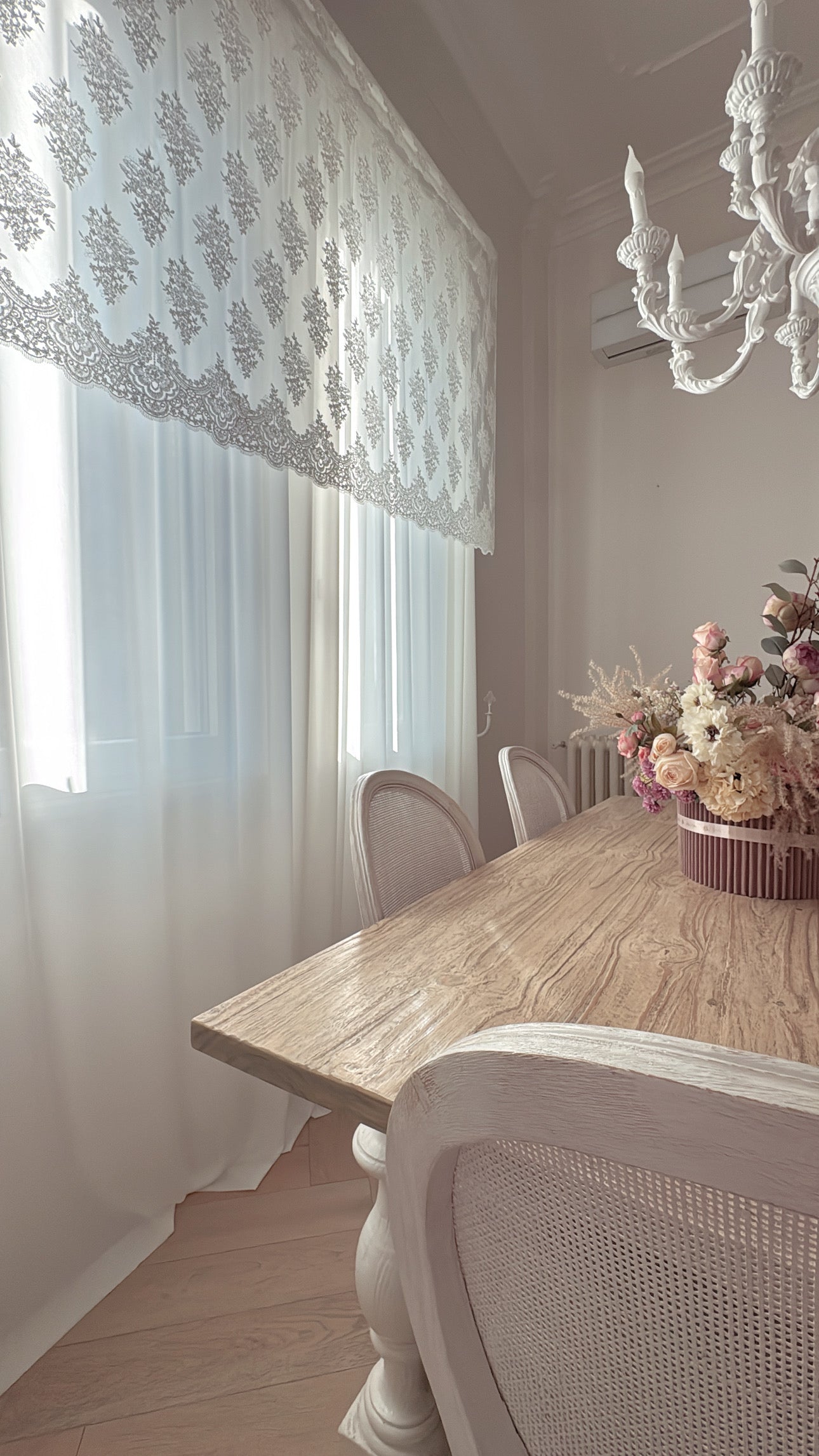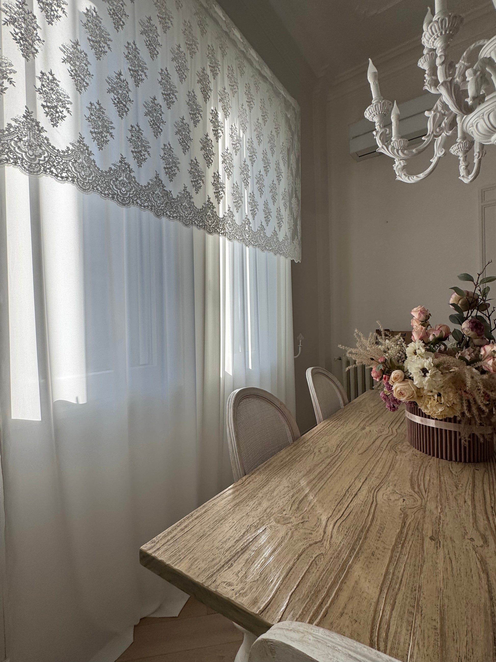 Elegante e raffinata, questa tenda è realizzata in morbida georgette color latte, un tessuto leggero e fluido che dona luminosità e delicatezza all’ambiente. La mantovana in pizzo, alta 135 cm, arricchisce la parte superiore con un raffinato gioco di trasparenze e motivi romantici, perfetta per aggiungere un tocco di classe e femminilità.